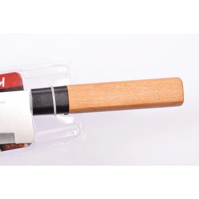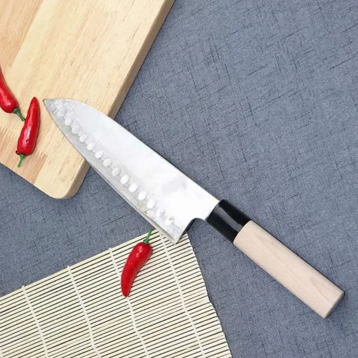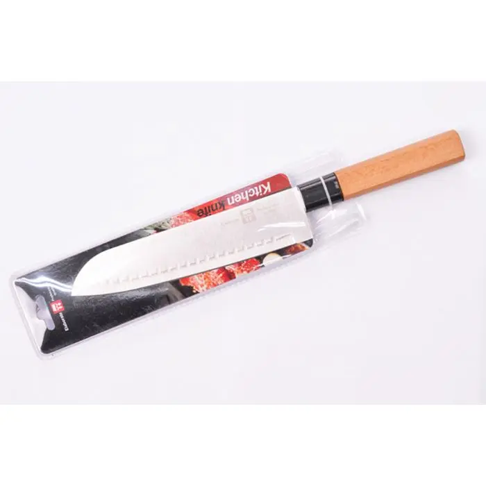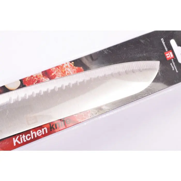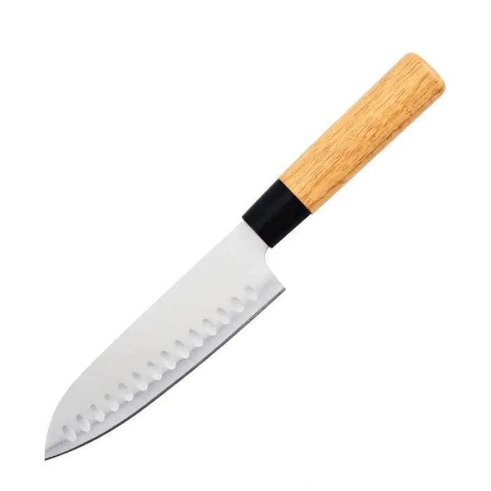 Modelo: santokuMarca: ElaborateMaterial: acero inoxidableMedida aproximada: 33cmLargo de hoja: 20.50cmSe puede utilizar para: carnes, pescados y verdurasPresentado con cobertura de plástico para exhibir