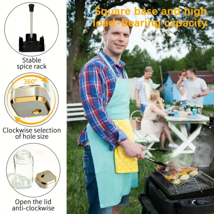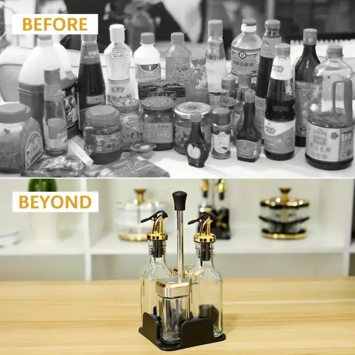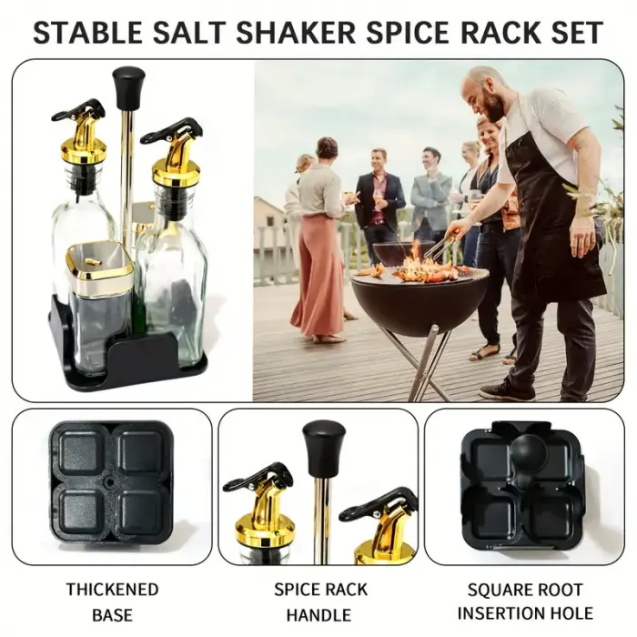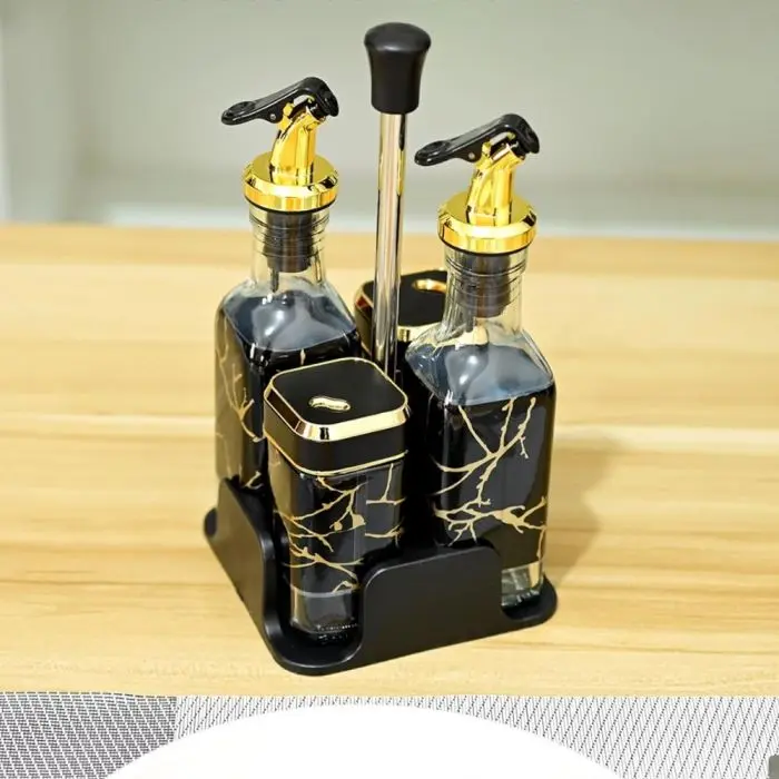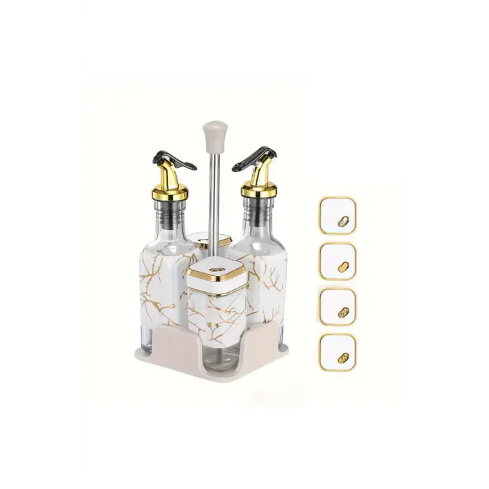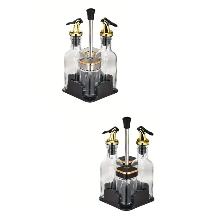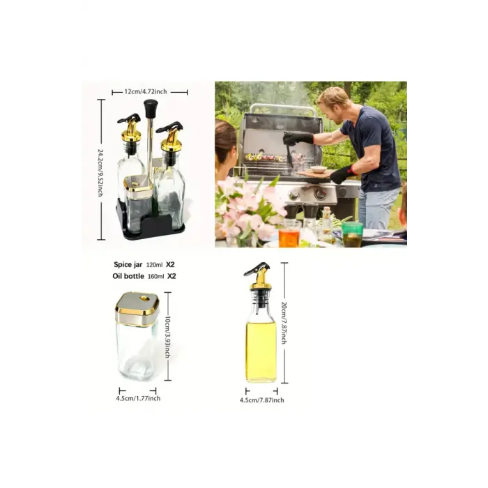Caracteristicas:- 2 Aceiteros 160ml (20x5cm) y 2 Saleros 120ml(10x5cm)- Medida Total: 25x12cm- Material Base: Plastico- Material Envases: Vidrio- Pico Aceitero a Presion- Tapa Salero 360°